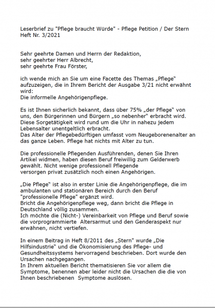 * Leserbrief * „Der Stern“, 14.01.2012: „Pflege braucht Würde“