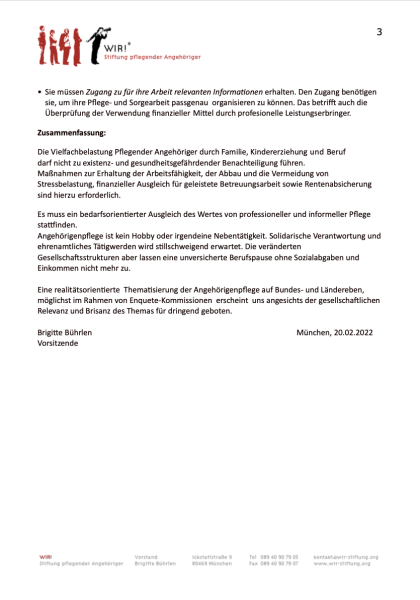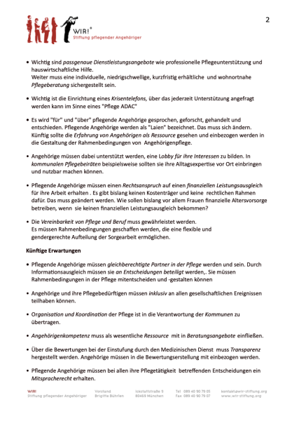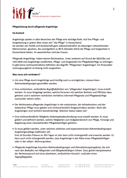 WIR! Stellungnahme: „Pflegeleistung durch pflegende Angehörige“